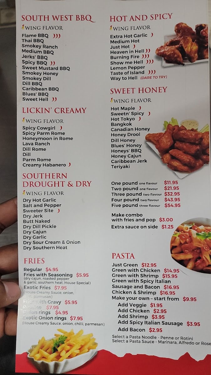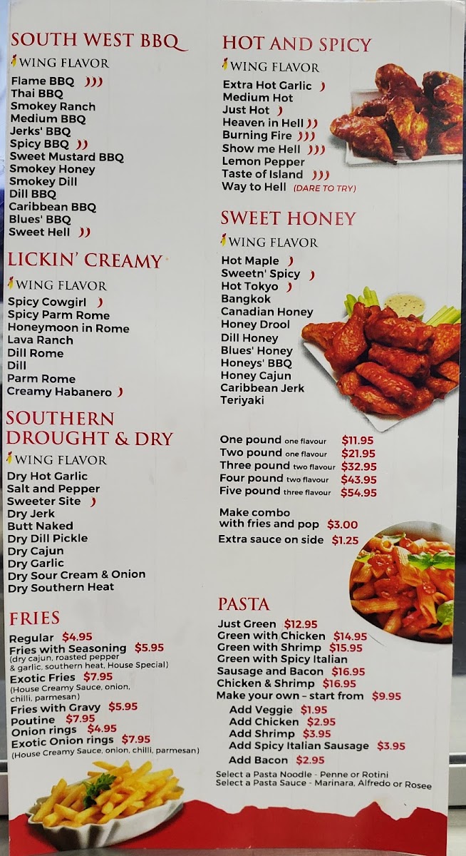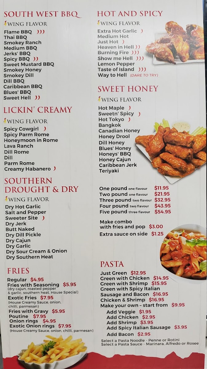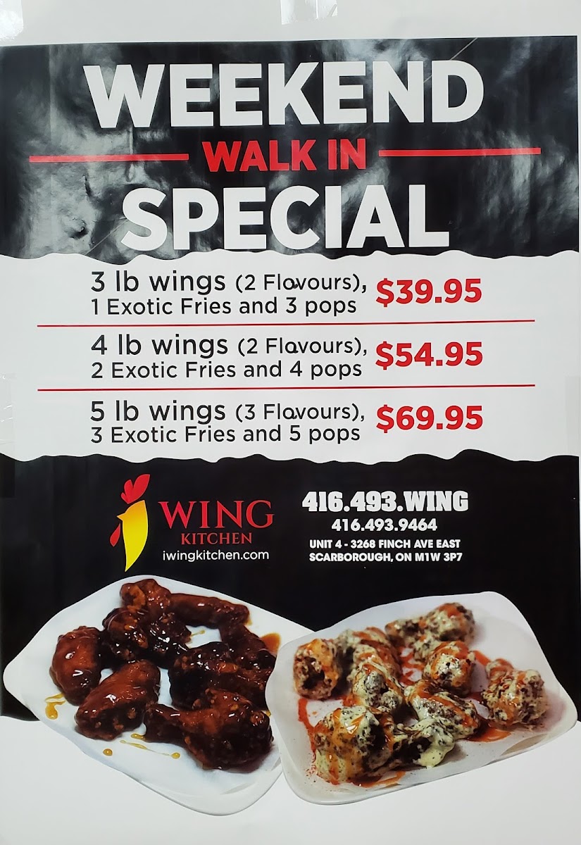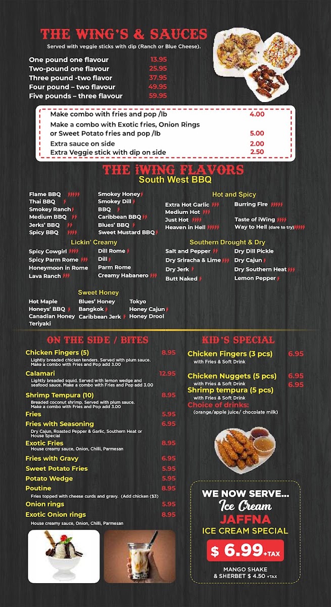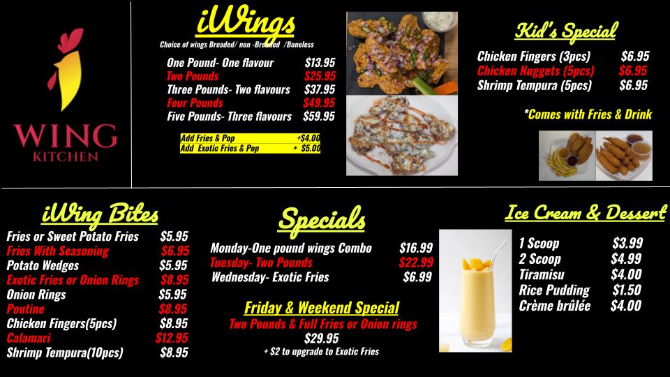 Overall, the menu at I Wing Kitchen offers a focused yet satisfying selection that highlights classic comfort bites and generous wing portions. The beverage options like Water Bottle, Red Bull, Minute Maid Bottle, and Can Pop keep things simple but practical. On the side, items such as Chicken Fingers (5), Fries, Sweet Potato Fries, Shrimp Tempura (10), and Exotic Onion Rings provide a nice variety of crispy accompaniments that pair well with their main offerings. The real standout is their wings menu, featuring hearty options like Three-Pound Wings - Two Flavors, Three-Pound Wings - Two Flavors Combo, Four-Pound Wings - Two Flavors, Five-Pound Wings - Three Flavors, and the more modest One-Pound Wings - One Flavor Combo, catering to both solo diners and groups. While specific prices aren’t listed, the portion-based structure suggests good value and flexibility, making it easy to customize based on appetite. Overall, the menu feels straightforward, indulgent, and well-suited for wing lovers looking for variety in flavors and shareable portions.